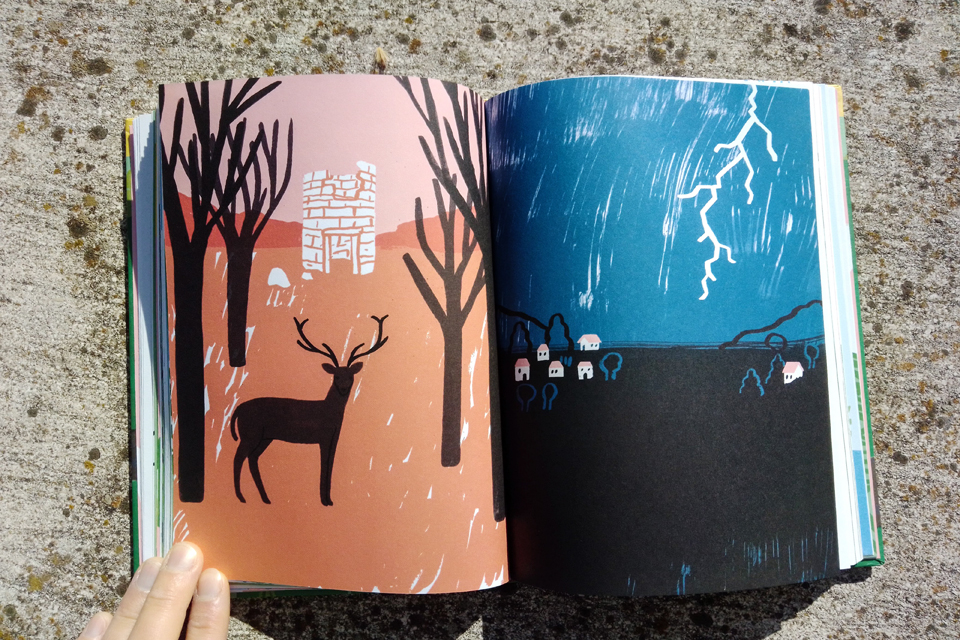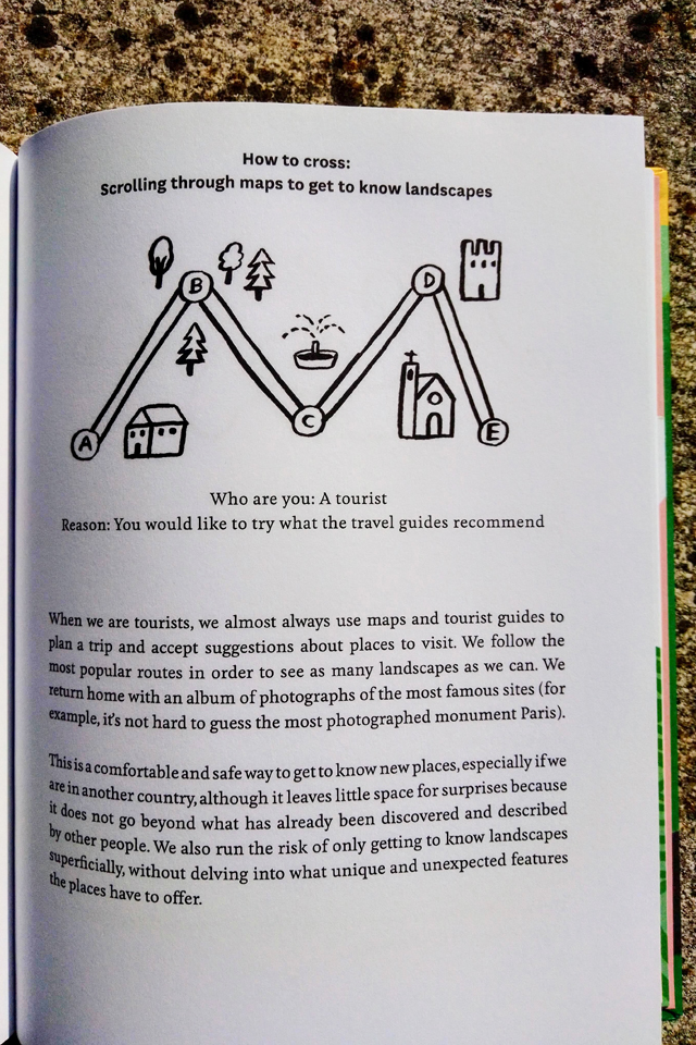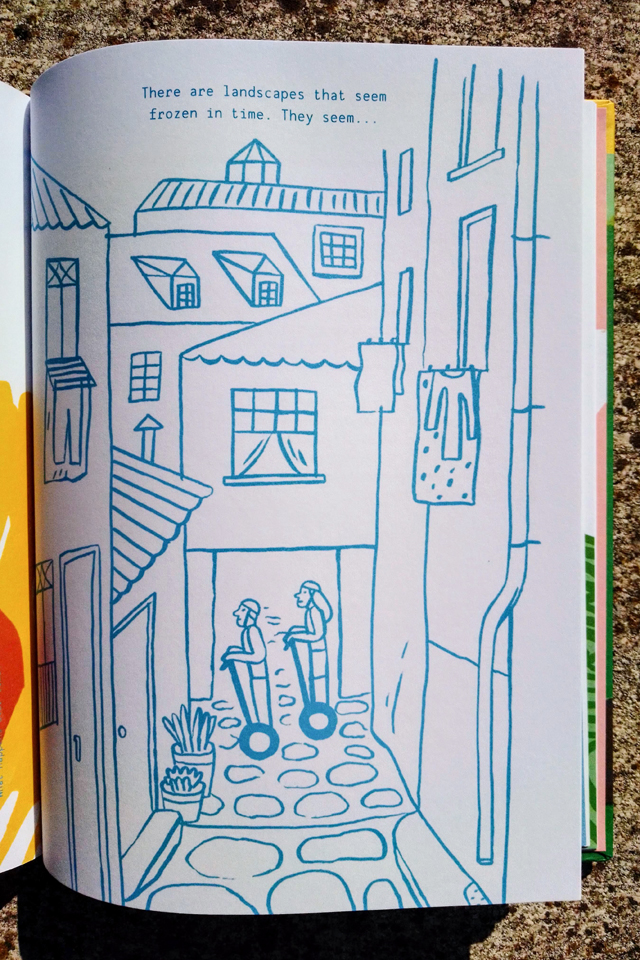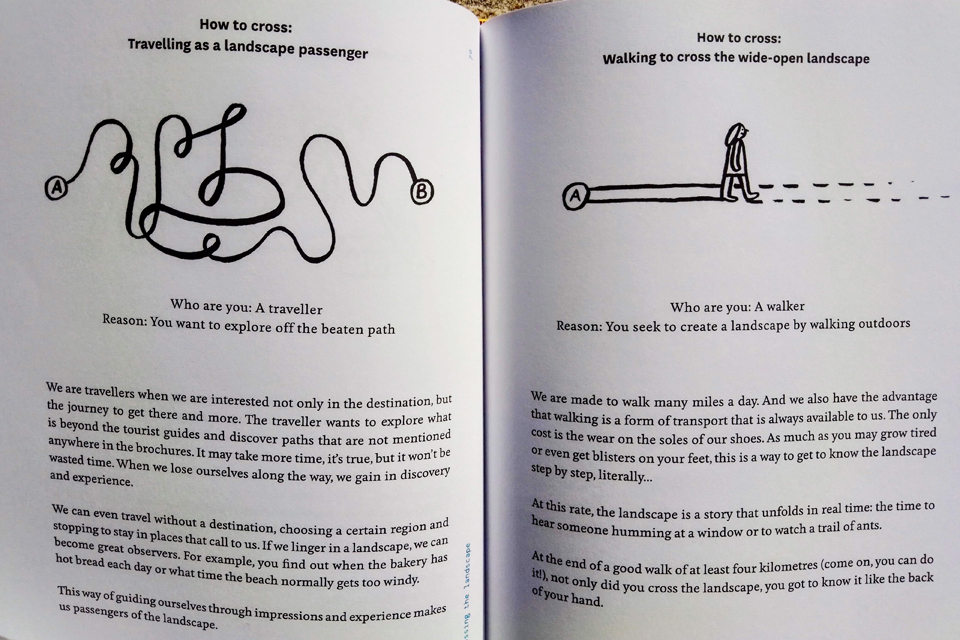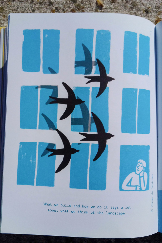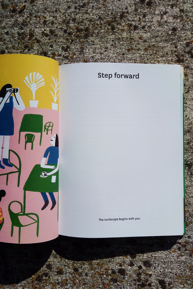 Druhou knihou, bez které jsem nemohla odejít, je „What‘s around us? Landscape Exploration Guide“, anglické vydání titulu, za nímž stojí portugalská autorka Maria Manuel Pedrosa a ilustrátorka Joana Estrela. Je určená spíš větším čtenářům, kterým pokládá zneklidňující otázky týkající se vnímání krajiny („Když si nikdo krajiny nevšimne, existuje vůbec?“) a vzrušující návody na její zkoumání („Nebojte se ztratit se!“). Upozorňuje na to, že krajina není jen ta fotka na pohlednici z prázdnin, ale že i my jsme její neoddělitelnou součástí a neseme za ni zodpovědnost. To vše podáno poutavým způsobem a doplněno vtipnými ilustracemi.