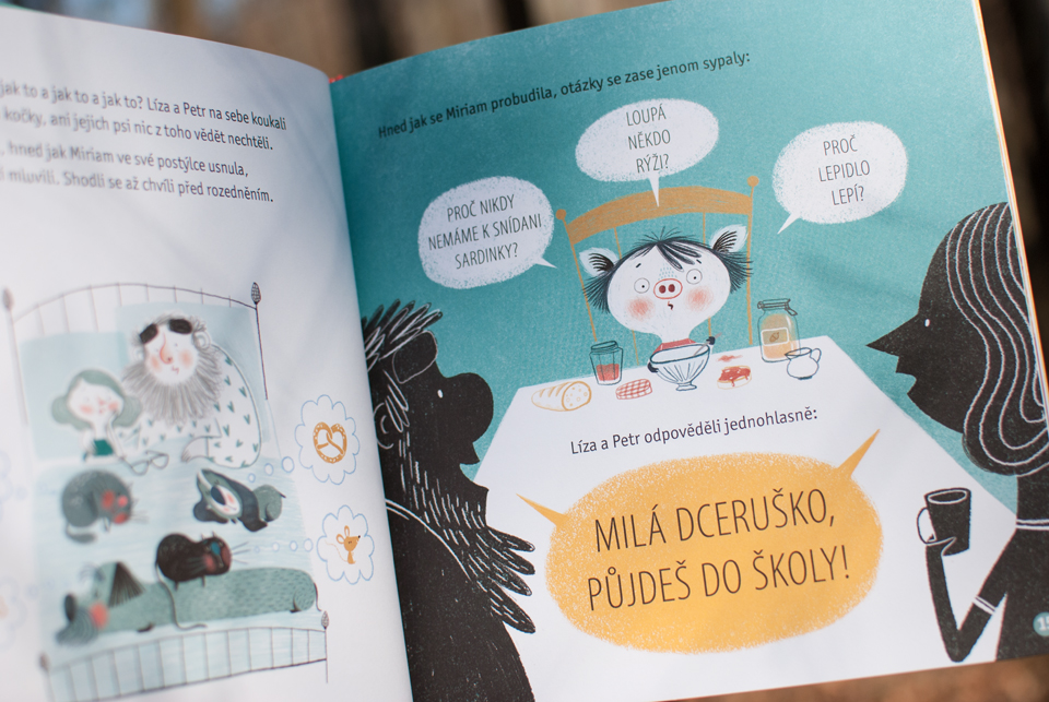 Miriam se naučí čistit si zuby, jíst příborem, zdravit, splachovat záchod a mýt si ruce. Je z ní malá prasečí slečna, která za sebou sice tahá plyšového vlka, ale zároveň svým vyvinutým intelektem uvádí adoptivní rodiče do rozpaků. Klade množství otázek, na které Líza s Petrem neznají odpověď. Loupá někdo rýži? Proč lepidlo lepí? Proč není rub na líci? Proč mají vlnu beránci a ne pavouci? A tak je rozhodnuto, Miriam půjde do školy.
