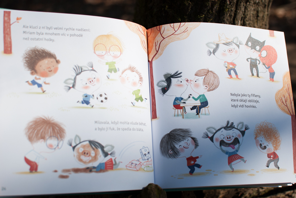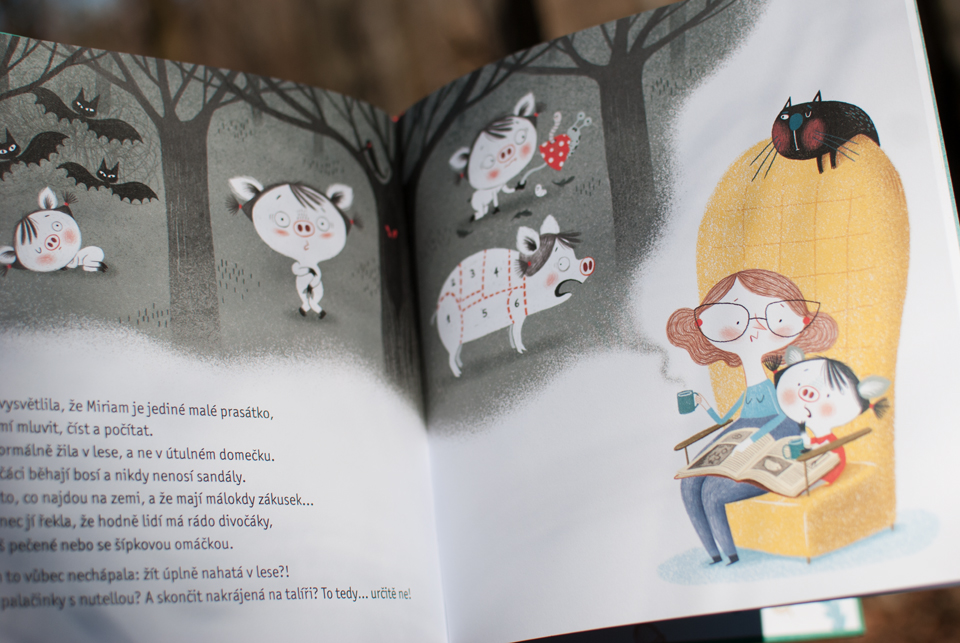 Je s podivem, jak často se v dětských knihách objevují prasátka. V češtině máme pro tohle zvířátko pěkné množství synonym. Prasátko, pašík, čuník, vepřík, podsvinčátko – v literatuře hrají prasata většinou pozitivní roli. Pravdivý příběh o prasátku francouzských autorek Emilie Chazerand a Amandine Piu, vydaný v češtině před nedávnem nakladatelstvím Portál, vypráví o malé divočáčí holčičce, kterou najde postarší pár Líza a Petr opuštěnou v lese. Petr je nadšen a už vidí bublající hrnec šípkové omáčky. Líza je také nadšena, pojmenuje prasátko Miriam a Petrovi řekne, že je trouba.